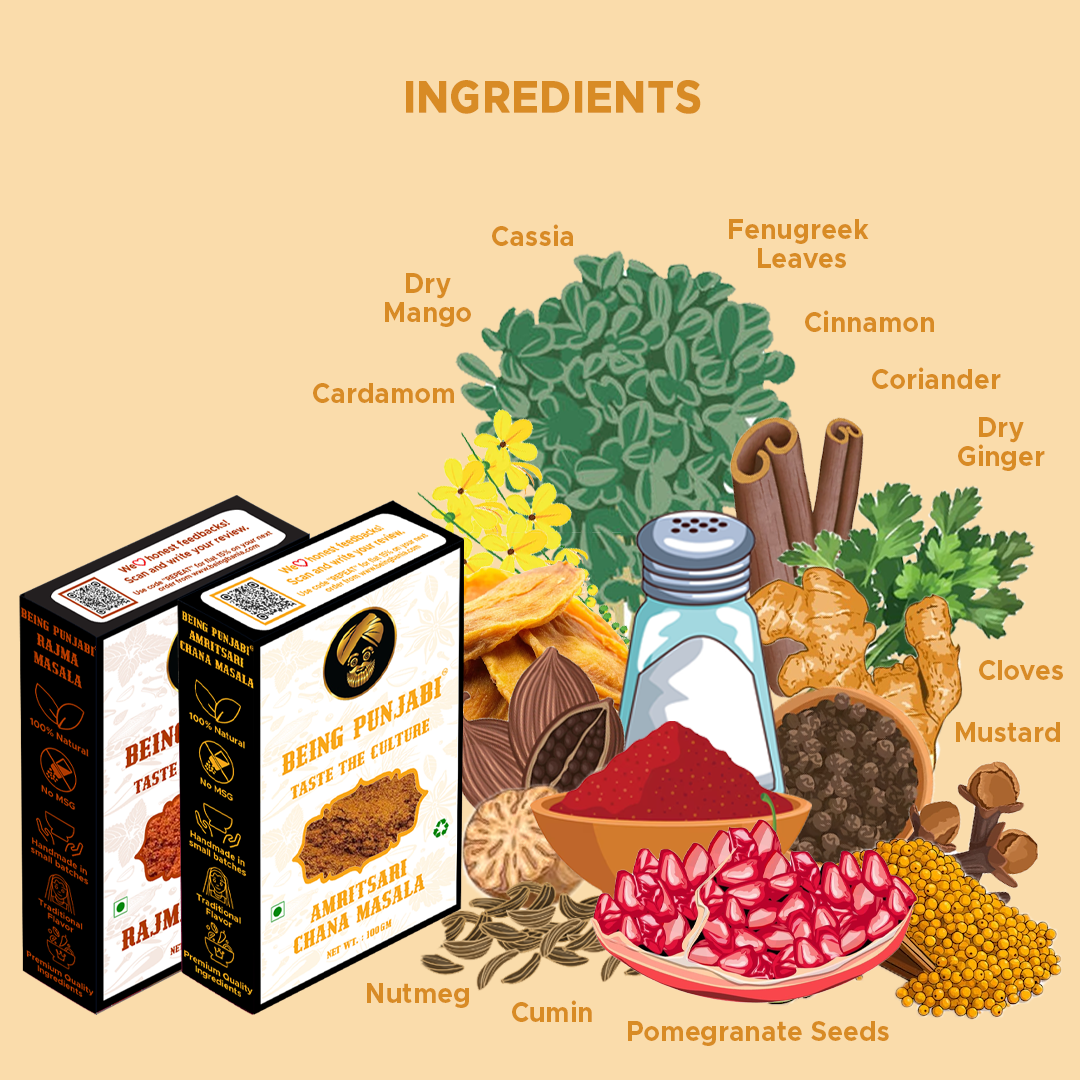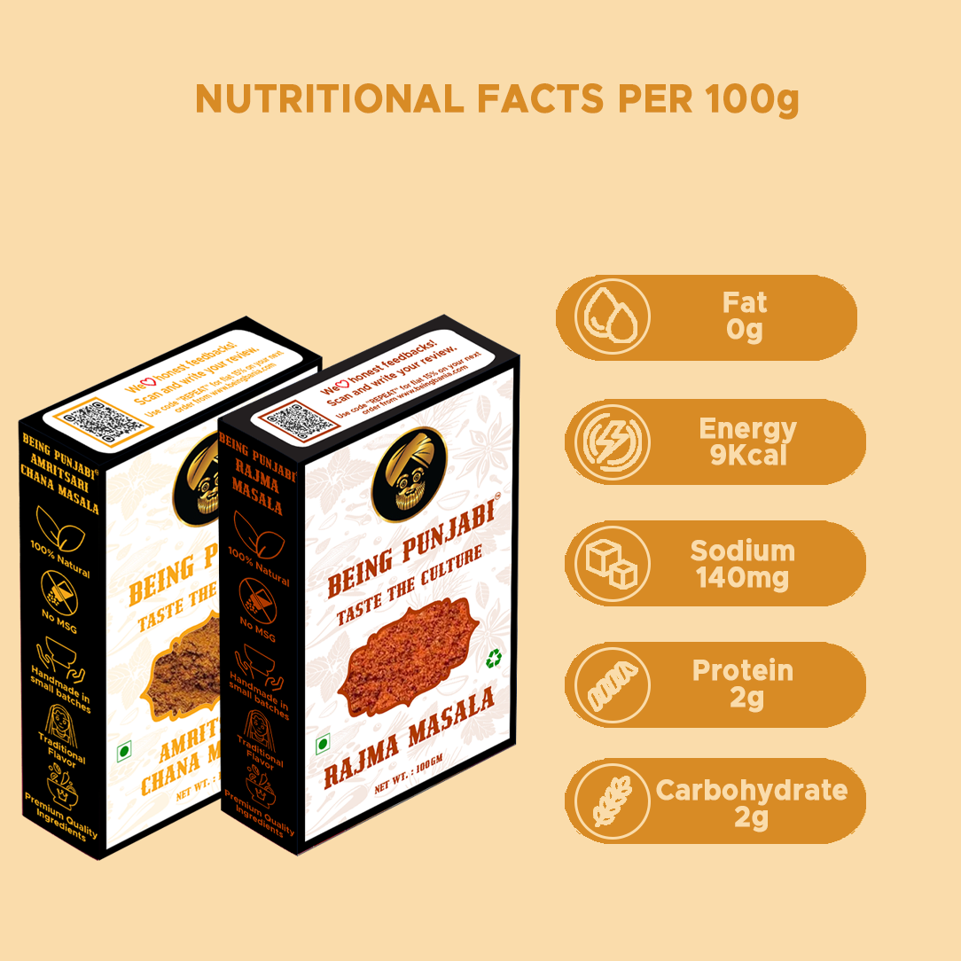 Experience the authentic taste of Punjab with the Being Punjabi Amritsari Chana Masala & Rajma Masala Combo. Crafted by hand using premium ingredients, these blends are free from preservatives, MSG, and fat, ensuring a natural and wholesome flavor. Rich in bold, aromatic spices, they bring traditional, hearty flavors to your kitchen, delivering the perfect balance of taste and aroma for a truly satisfying meal.
