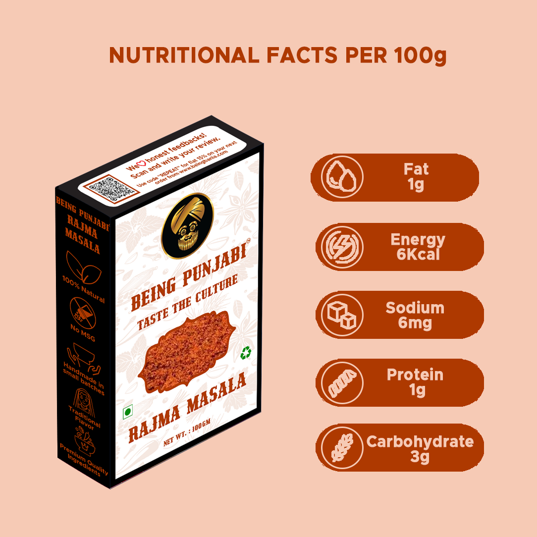 Being Punjabi Rajma Masala is a premium, handmade blend crafted from an heirloom recipe to deliver an authentic, bold flavor. Made with 100% natural, vegan ingredients, it contains no preservatives or MSG. This aromatic masala preserves the traditional taste of Punjabi cuisine, ensuring a rich and genuine experience in every dish.