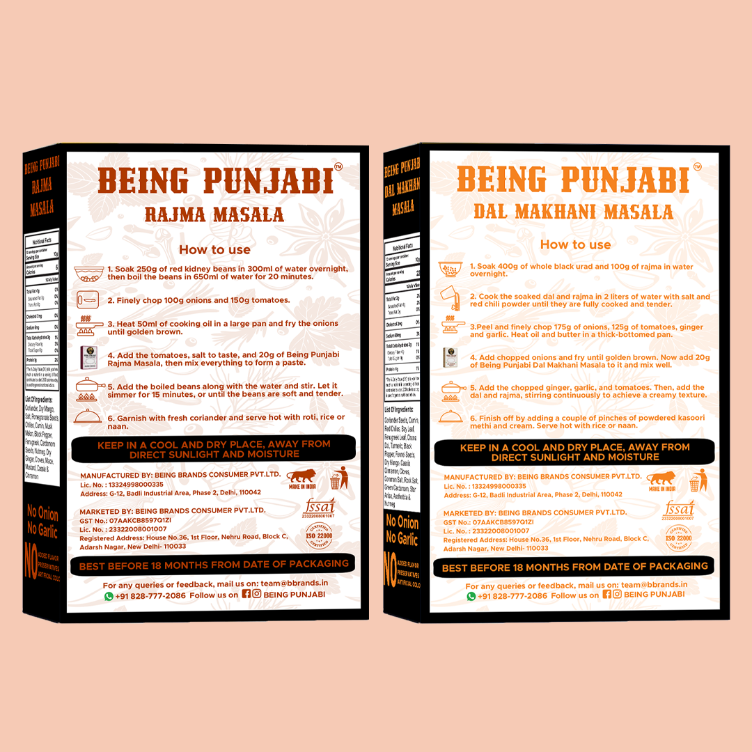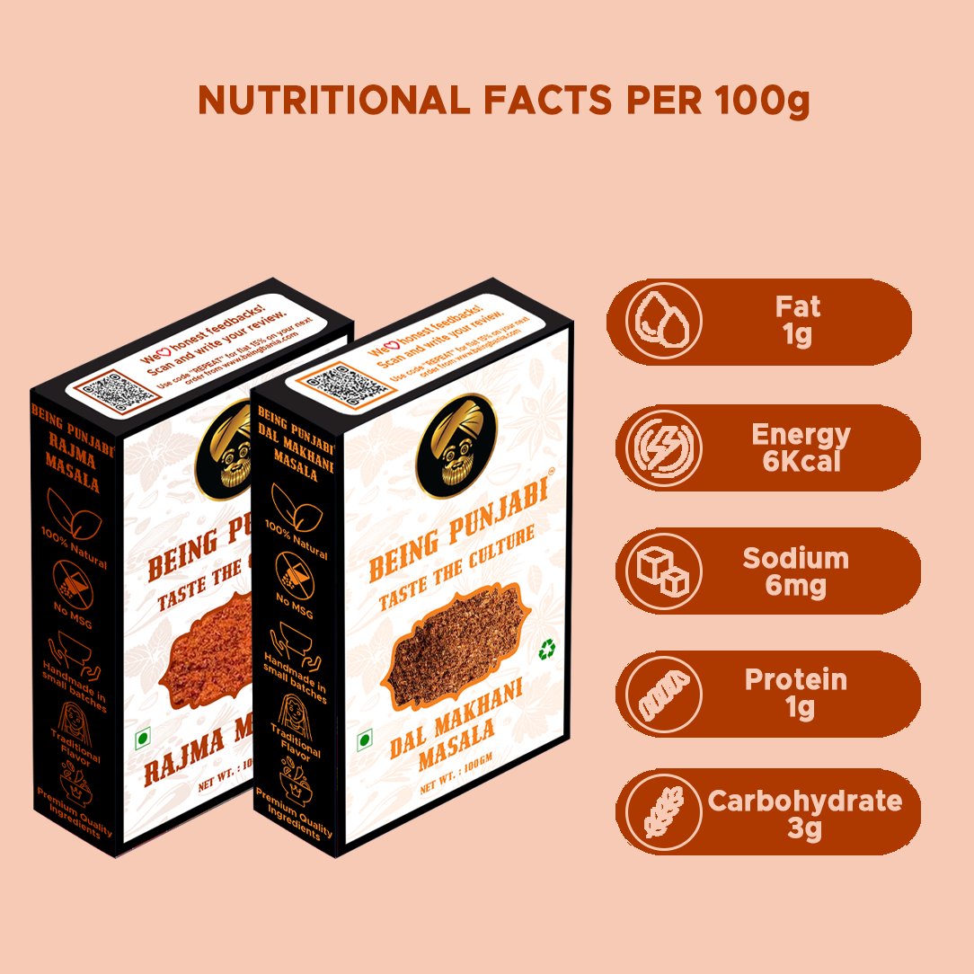 Experience the authentic taste of Punjab with Being Punjabi's traditional masala combo featuring Dal Makhani and Rajma Masala. Each 100g pack is carefully handcrafted in small batches using 100% natural ingredients including aromatic spices like cardamom, cinnamon, cumin, coriander, fenugreek leaves, and pomegranate seeds. This premium spice blend contains no MSG or preservatives, ensuring you get the pure, traditional flavour that makes Punjabi cuisine so beloved. The expertly balanced combination of dry mango, cassia, cloves, mustard, and nutmeg creates an authentic taste that brings restaurant-quality dishes to your kitchen. Perfect for preparing rich, flavourful dal makhani and rajma that your family will love. Simply add these traditional masalas to your cooking for an instant taste of Punjab's culinary heritage.