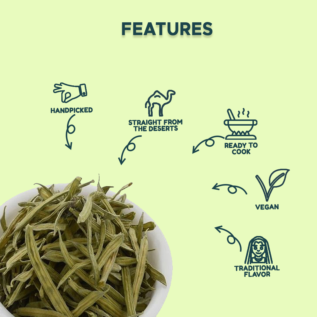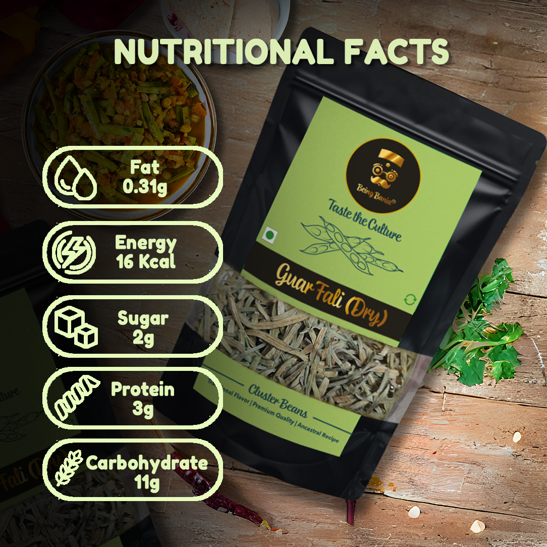 Being Bania Gaur Fali is a staple of Rajasthani cuisine, carefully handpicked and sundried in Rajasthan. Guar beans have a long and slender body and are commonly used as vegetables and in lentils. Beyond their deliciousness, gaur fali are revered in Rajasthan, often paired with the famous Ker Sangri dish. Their popularity extends beyond borders, winning hearts globally. The best part? They're a healthy snack packed with protein, fiber, and vitamins, making them a guilt-free indulgence that keeps you energized.